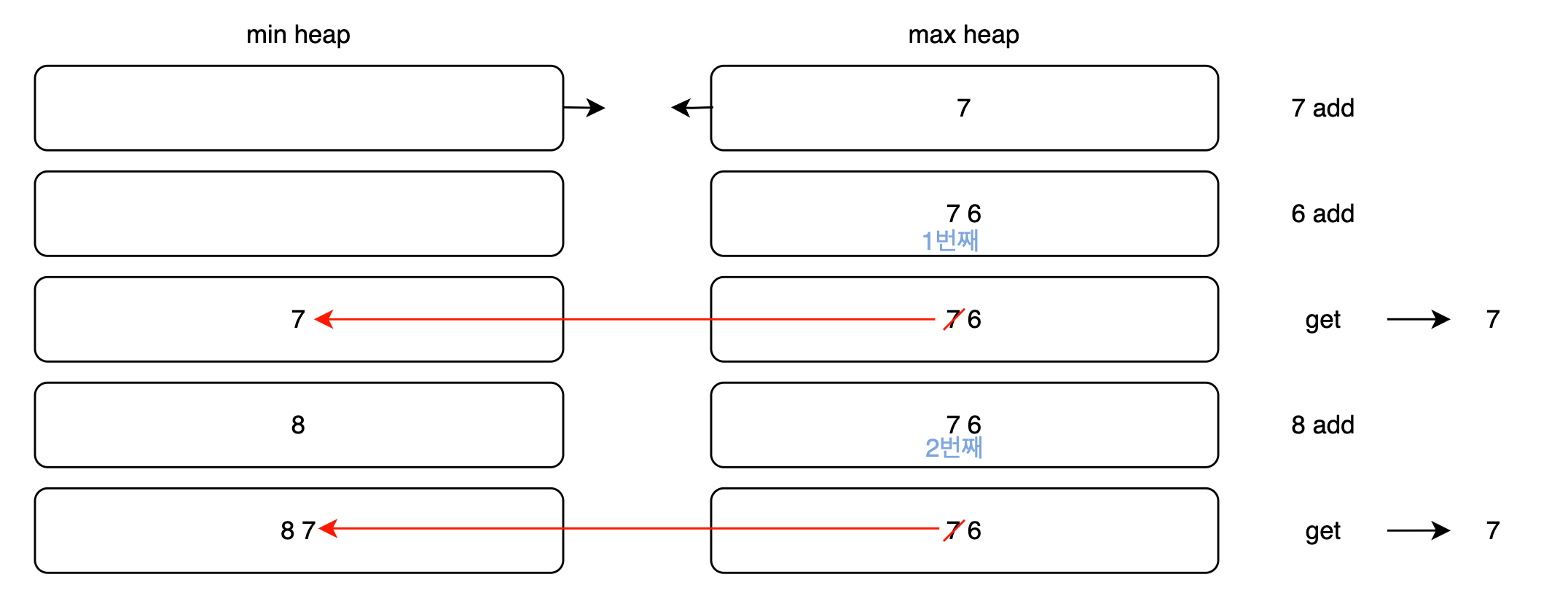 그림을 보면 min heap, max heap에 걸쳐서 몇 번째의 것을 뽑으면 되는지 눈에 보입니다. min heap은 n번째 뽑아야 할 후보를 max heap으로 넘겨주는 중요한 역할을 합니다. 예를 들어 위 그림에서 첫번째 get의 경우 7을 빼어 그 당시 2번째 뽑으면 되는 6을 제일 우선순위 높게됩니다. 하지만 그 후 8이 들어오고 나서 2번째 뽑을 순위가 다시 7이 되어 버렸죠. min heap이 이미 1개가 get이 된 상황에서 그 중 get하게 될 후보가 8보다는 7이 다시 가는게 적합하다고 판단한거죠(물론 min heap에 따를 뿐이지만 역할로 따진다면). 이렇게 add할 때마다 무조건 적합한 후보 하나는 max heap으로 꼭 보내기 때문에 get을 개수만큼 하면 부족함없이 모두 잘 뽑히게 됩니다.